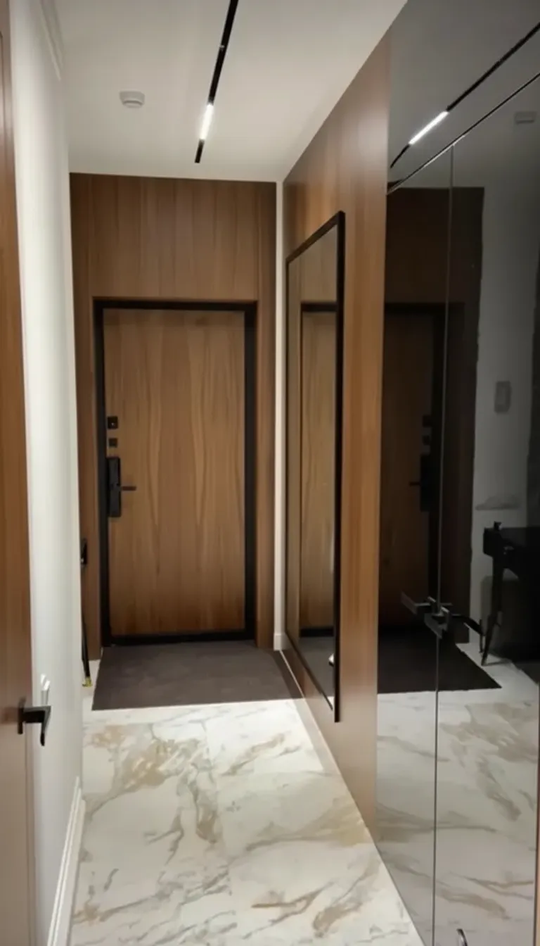 Объект в Москва Сити. Дизайнер Алена. Были выполнены работы по облицовке стены стеновыми панелями . В едином стиле заменили накладку на входной двери.Панели из экошпона. Стоимость проекта по входной двери под ключ 75168 рублей февраль 2024 года.