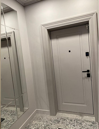 Входная дверь под заказ с порталом и фрезерованными наличниками в одном стиле с межкомнатной группой в эмали.