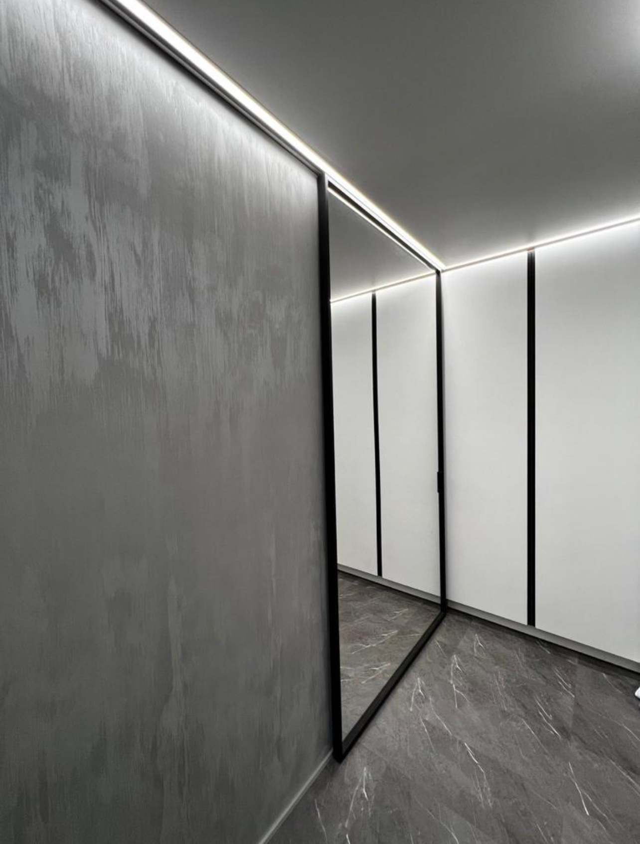 Зеркальное полотно на скрытом раздвижном механизме.