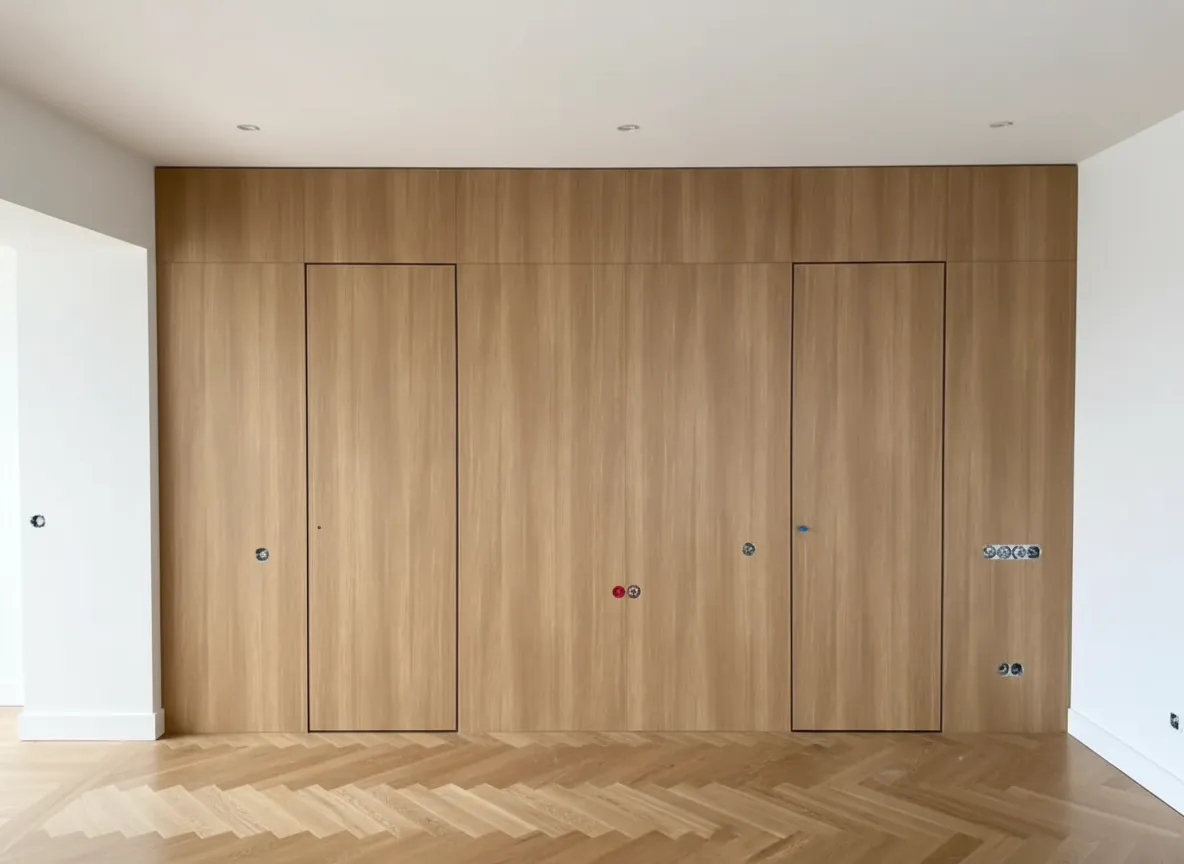 Полотна высотой 2300 мм в скрытых коробах в натуральном шпоне со стеновыми панелями.