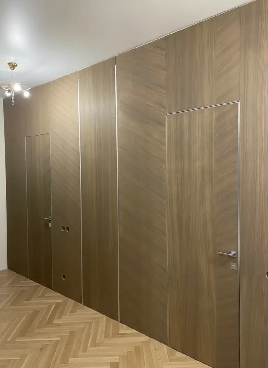 Двери с комбинированным шпоном (сложная рубашка) со стеновыми панелями.