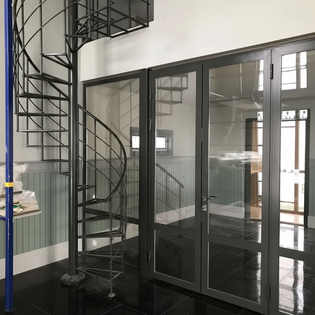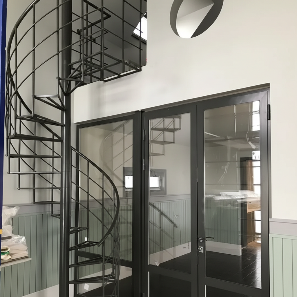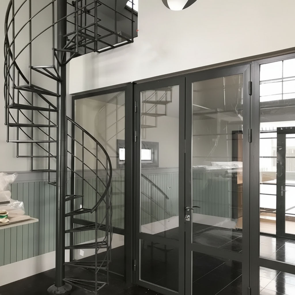В 2023 году команда Proem Studio реализовала проект по созданию центрального элемента интерьера в пос. Орел. Работа объединила два сложных направления: изготовление радиусной лестницы и панорамное интерьерное остекление.