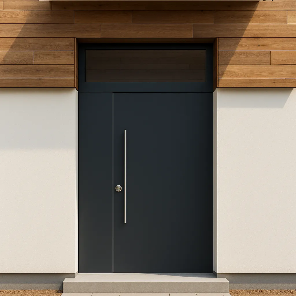 Двухстворчатая уличная термо дверь с фрамугой. Порошковая покраска с лаком и цинкогрунтом. Максимально тепло и шумоизоляция. В качестве утепления: 6-слойная термоизоляция: минеральная плита,пробковая термоизоляция, эструдированный полистирол, фольгированный вспененный полиэтилен, пенопласт, вспененный полиэтилен не фольгированный.