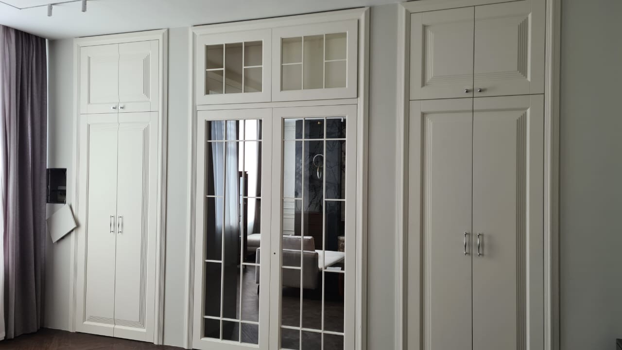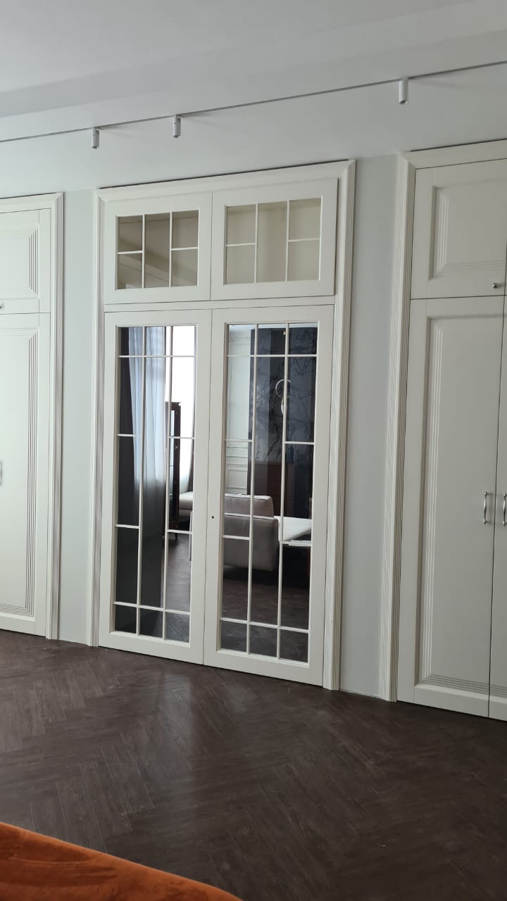 Распашная двухстворчатая дверь с фрамугой. Эмаль, скрытые петли.