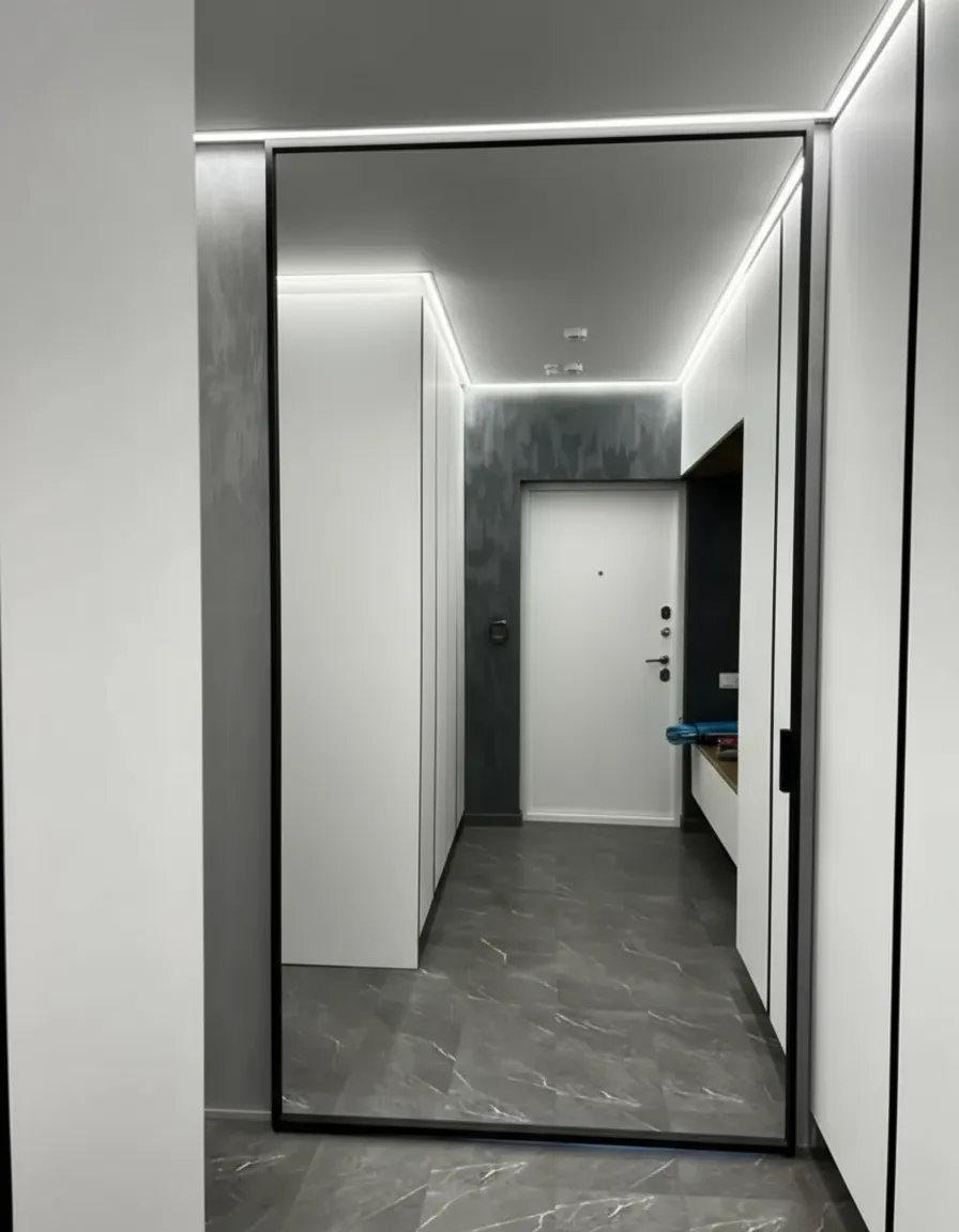 Зеркальное полотно на скрытом раздвижном механизме.