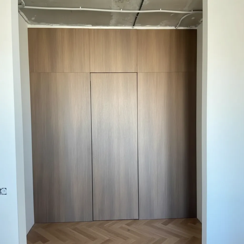Полотна высотой 2300 мм в скрытых коробах в натуральном шпоне со стеновыми панелями.