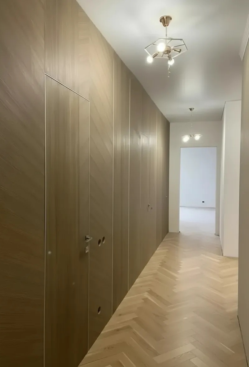 Двери с комбинированным шпоном (сложная рубашка) со стеновыми панелями.