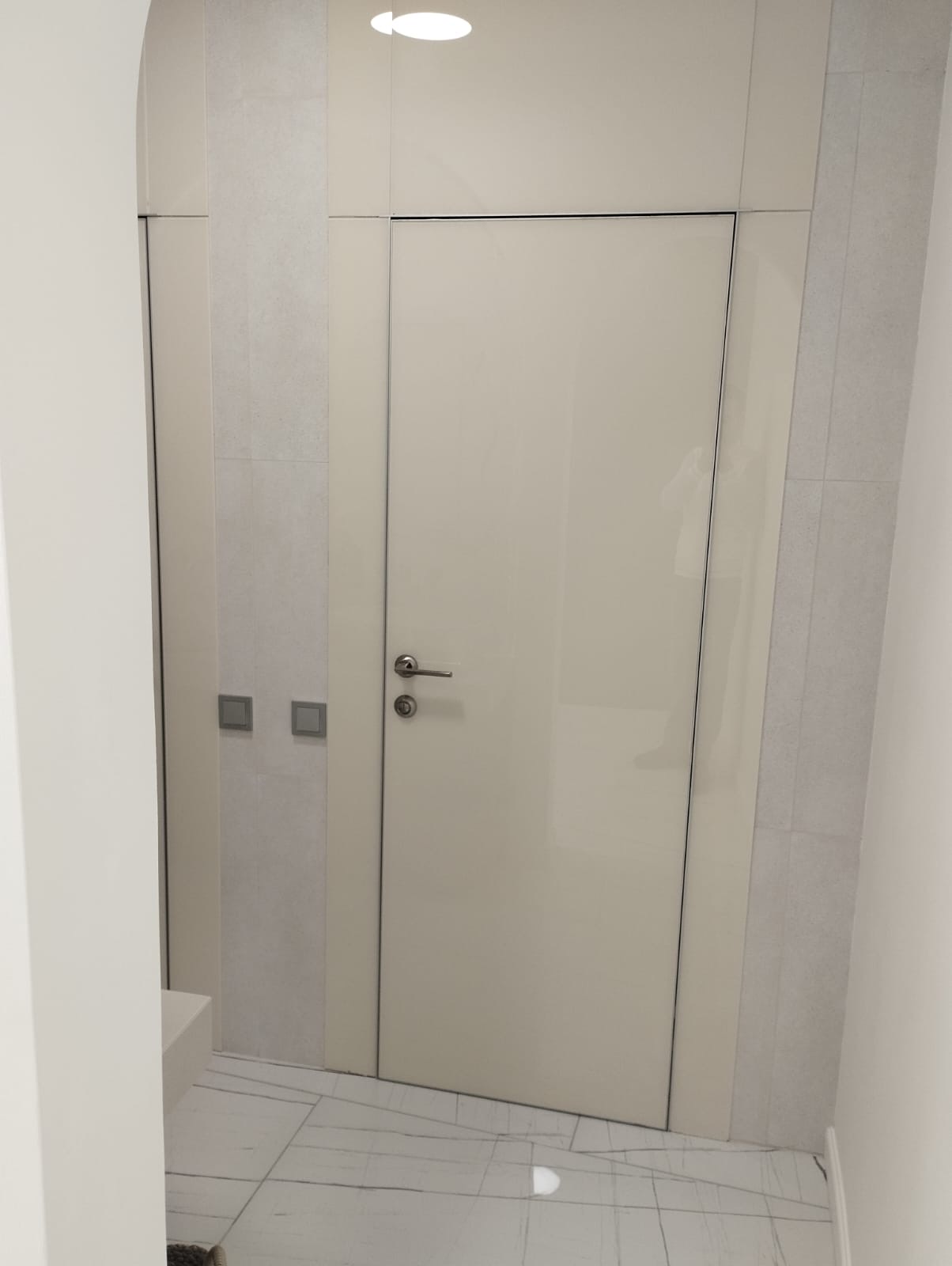 -Скрытый короб позволил дверному полотну полностью слиться со стеной, обеспечивая безупречную геометрию.